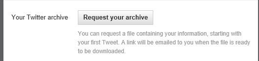 O Twitter agora permite que você baixe uma coleção de todas as suas mensagens, além do limite de 3.200 imposto pela API. Para ver se a novidade está disponível para você, vá até o fim da tela de configurações. Depois de requerer seu arquivo, tudo que tem que fazer é esperar: o Twitter envia um e-mail avisando que está pronto.